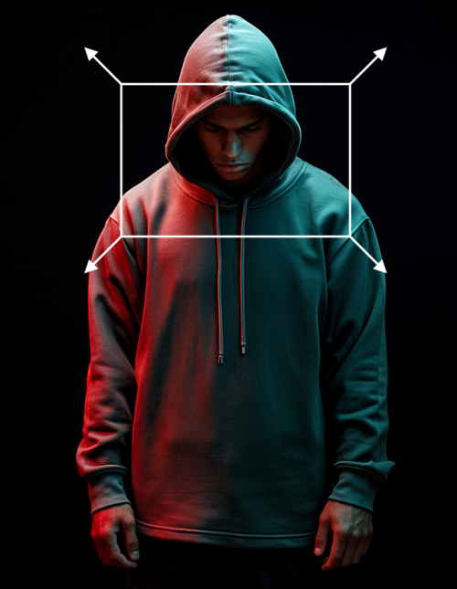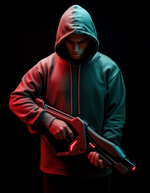 As an additional step, the original image and the gun were used as inputs in an AI inpainting process to place the gun into the subject’s hands.